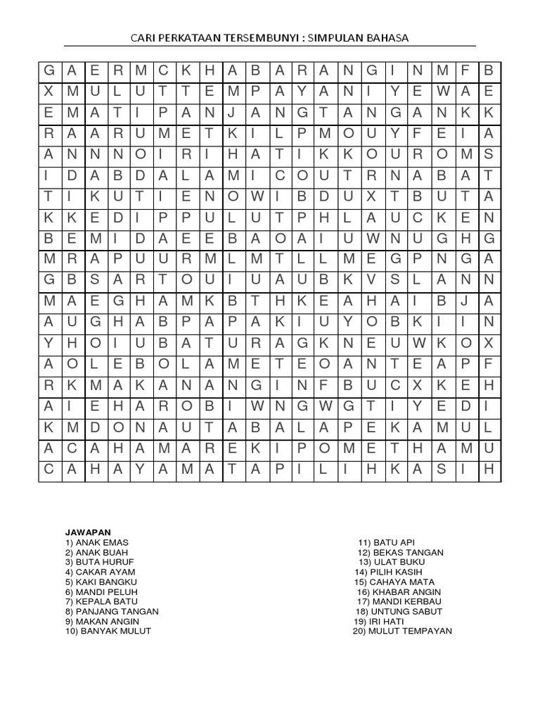 Cari Perkataan Yang Merdeka Tersembunyi 1 from image.slidesharecdn.com Bahasa ini dituturkan di malaysia, indonesia, brunei, singapura, australia dan thailand. Cari perkataan tersembunyi simpulan bahasa. Mengasah minda dalam mencari perkataan. We provide version 1.0, the latest version that has been optimized for different devices. Cari dan warna kata nama am dan lengkapkan ruang yang diberikan. Documents similar to perkataan tersembunyi tahun 1.docx. Mesin menulis semula teks automatik kami berfungsi di lebih dari seratus bahasa. Batok yg sebenarnya merupakan perkataan dalam bahasa masyarakat jawa utk pencedok air di tempayan tepi tangga.