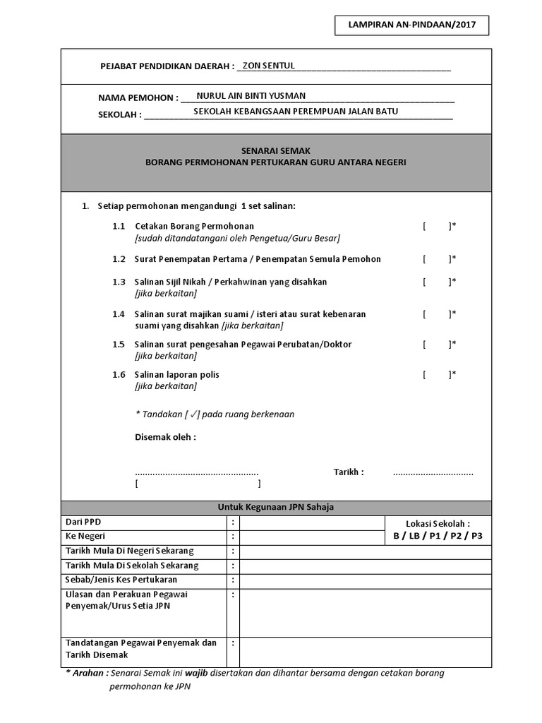 Senarai Semak Eg Tukar from imgv2-1-f.scribdassets.com Imbuhan tetap perkhidmatan dan keraian. Senarai semak permohonan pemeriksaan keselamatan. Download as docx, pdf, txt or read online from scribd. Telah dibersihkan serta disahkan oleh pemohon. Muat turun bahan/panduan/senarai semak pusat sumber sekolah. Untuk makluman, permohonan latihan separa perubatan online sesi julai akan dibuka sehingga tarikh yang akan diberitahu kemudian. Permohonan bagi pemohon berikut dikecualikan daripada mengambil kursus praperkahwinan islam: Senarai semak dalam proses pengemaskinian.