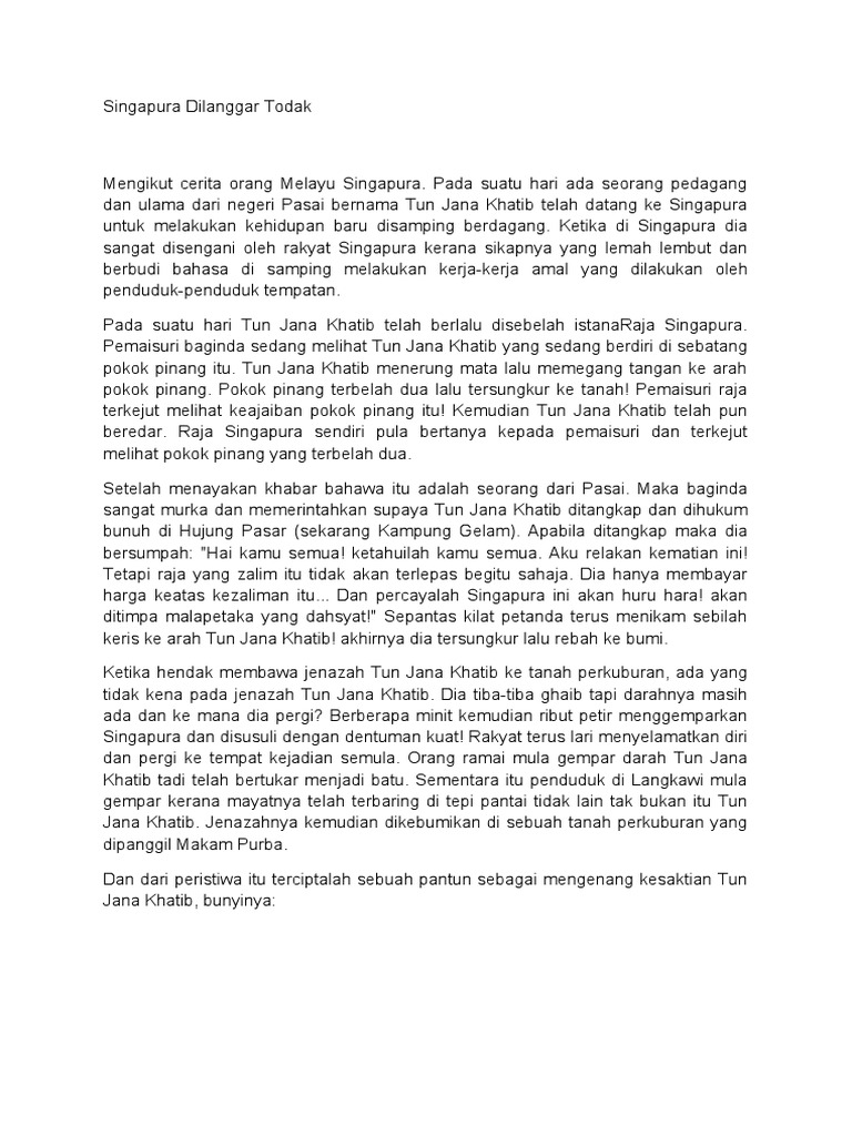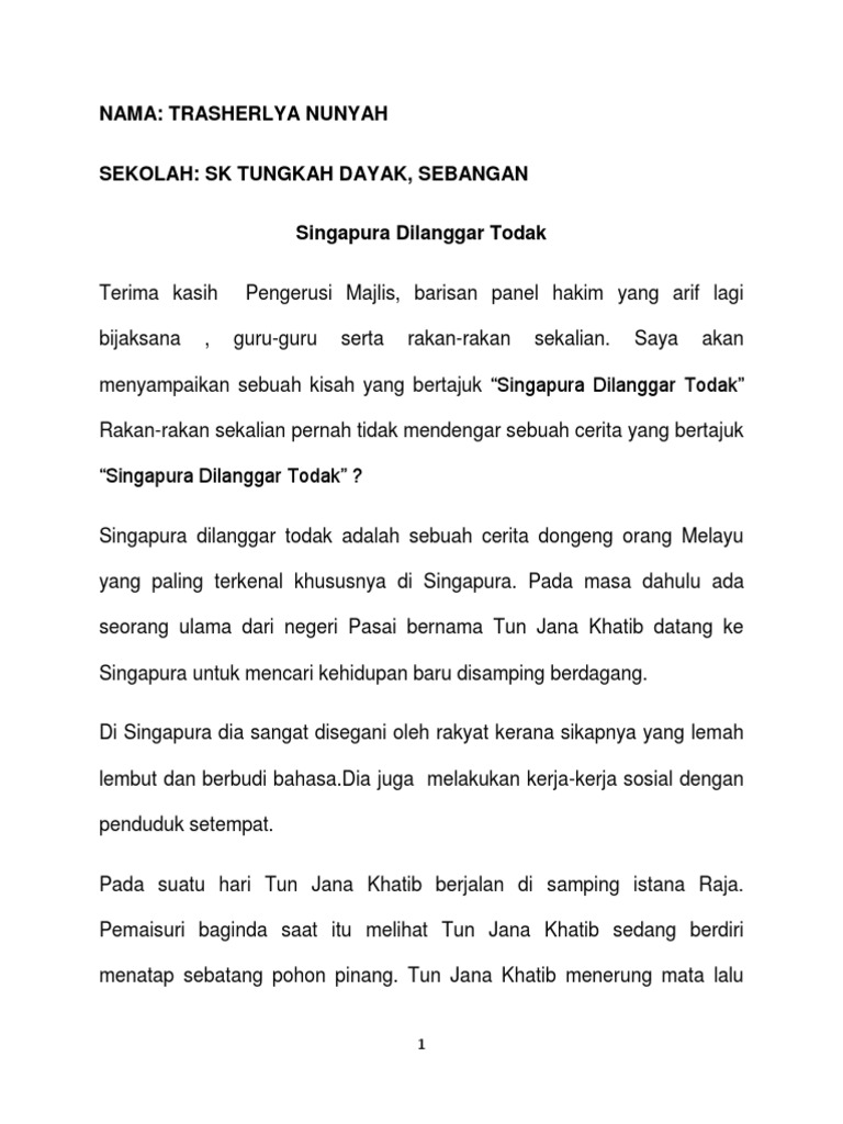 Singapura Dilanggar Todak from imgv2-2-f.scribdassets.com Swordfish atau ikan todak xiphias galduys linnaeus berat maksimum ikan ini mencapai 682 singapura akhirnya bebas dari serangan ikan todak. Muncung ikan todak berukuran 15cm menikam leher idul. Singapura dilanggar todak adalah sebuah cerita lagenda orang melayu yang paling terkenal khususnya di singapura. Merungkai kebenaran lagenda singapura dilanggar todak | singapura. Penduduk berlarian menghindari serangan ikan itu. Tersebut cerita dahulu kala, kisah terjadi di singapura, todak menyerang tidak terkira, membunuh rakyat tidak berdosa. Penduduk pun dengan mudah membunuhnya dan kemudian mengambilnya untuk dimakan dagingnya. Singapura adalah negara yang di dalamnya terdapat banyak suku/etnis.