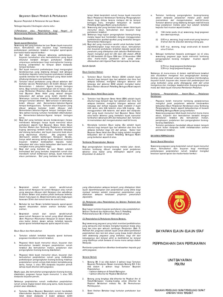 Tuntutan elaun gantian makan mengikut kadar elaun Pengoptimuman sumber, perkasa daya saing organisai. Perkara maklumat yang perlu disemak rujukan tuntutan pertukaran luar stesen 1.0 pastikan tuntutan perjalanan pertukaran ke luar stesen diterima dan dokumen sokongan disertakan. 1.2 surat arahan pertukaran daripada pihak Surat edaran jpa s 63 163 30 bertarikh 23 ogos 1994 surat mohon tangguh lapor diri surat kebenaran ke luar negara surat cuti tanpa gaji menjaga anak surat pengakuan tidak bekerja surat letak jawatan notis 24 jam surat pengesahan majikan berhenti kerja surat pengesahan majikan. 10/25 perkara maklumat yang perlu disemak rujukan tuntutan pertukaran. Surat pekeliling perkhidmatan bilangan 1 tahun 2016; Muka surat bab 1 pengenalan 1.1 perlembagaan 2 1.2 terminologi 2 1.3 singkatan 3 1.4 pemakaian 3 1.5 percanggahan 3 1.6 perubahan peraturan, kuantum dan kadar 3 bab 2 had dan bidang kuasa 2.1 jawatankuasa kewangan 5 2.2 jawatankuasa pengurusan kewangan dan akaun (jpka) 6 2.3 jawatankuasa audit 7 2.4 jawatankuasa pelaburan 8 (s)63/163/(30) para 2.2 bertarikh 23 ogos 1994. Pusat pentadbiran kerajaan johor lama. Jpa(s)63/151 klt.23(8) bertarikh 14 julai 2009. Yang ditetapkan oleh jabatan perkhidmatan awam melalui surat bil. 2 ogos 2007) (surat kementerian kewangan malaysia :